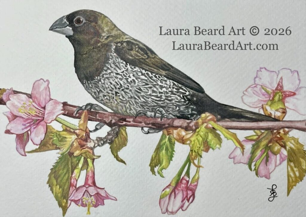 And because I wanted to get it knocked out, below is the finished piece. I spent a little more time on the details of the flowers and leaves, but most of my focus was on the intricate patterning of the bird’s chest, which is very textural and detailed. In case you are wondering why there is a touch of color on the base of the bird’s chest, it’s just light bouncing off the leaves and petals onto the bird, creating color pools on the feathers before that light is bounced towards our eyes to see it and the bird. I call it “color pooling”.